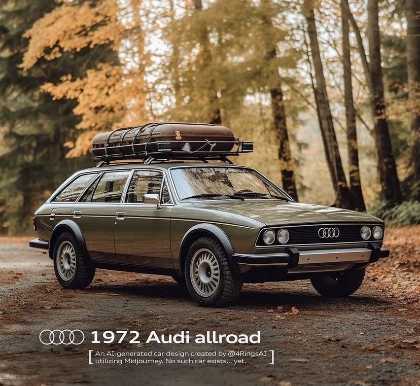 Immaginiamo allora una Audi Allroad 1972, mai davvero nata, ma che avrebbe potuto esserci. Un’auto che univa la linea sobria e squadrata delle Audi 100 dell’epoca a un’anima da esploratrice. Fanali rotondi, cromature essenziali, e un assetto rialzato pronto per affrontare i sentieri alpini. Sarebbe stata la compagna perfetta per i viaggiatori in giacca di tweed, che la domenica lasciavano la città per perdersi tra boschi e rifugi.