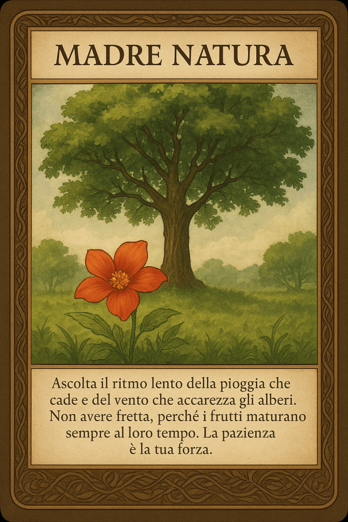 Oggi Madre Natura ti sussurra: “Ascolta il ritmo lento della pioggia che cade e del vento che accarezza gli alberi. Non avere fretta, perché i frutti maturano sempre al loro tempo. La pazienza è la tua forza.”