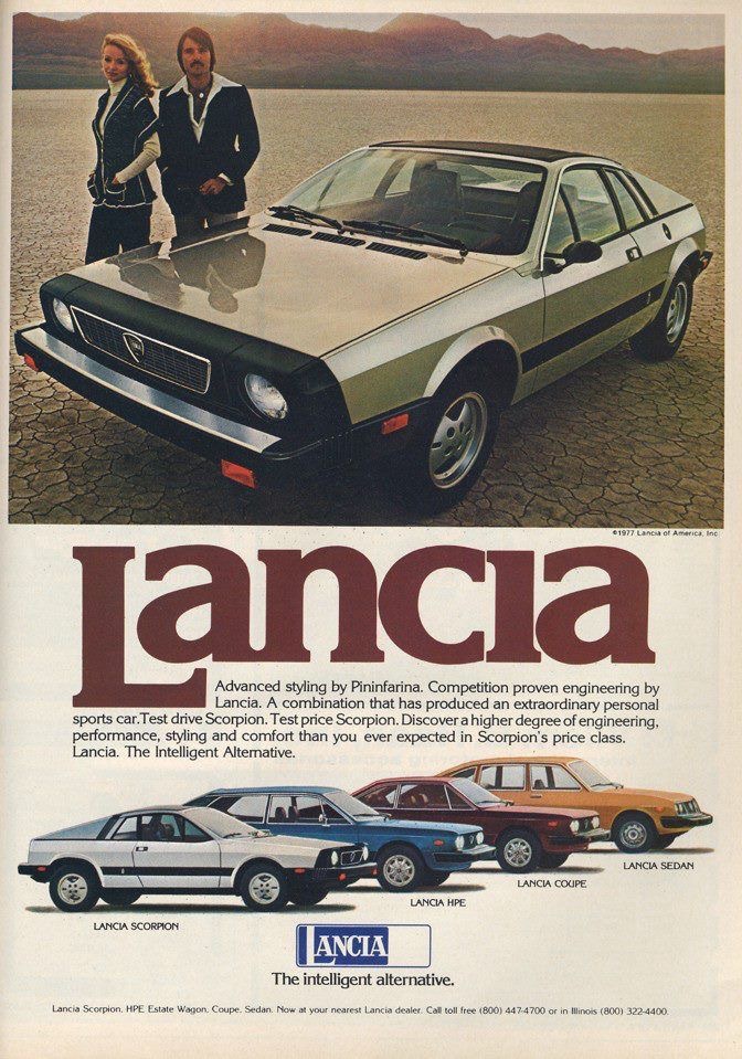 Nella pubblicità, la Scorpion è parcheggiata in un paesaggio quasi lunare: la terra brulla sotto i piedi, l’orizzonte infinito dietro le spalle. Accanto, una coppia anni ’70: giacche ampie, capelli ribelli, sguardo fiero. Non era solo un’auto: era un modo di vivere il futuro.