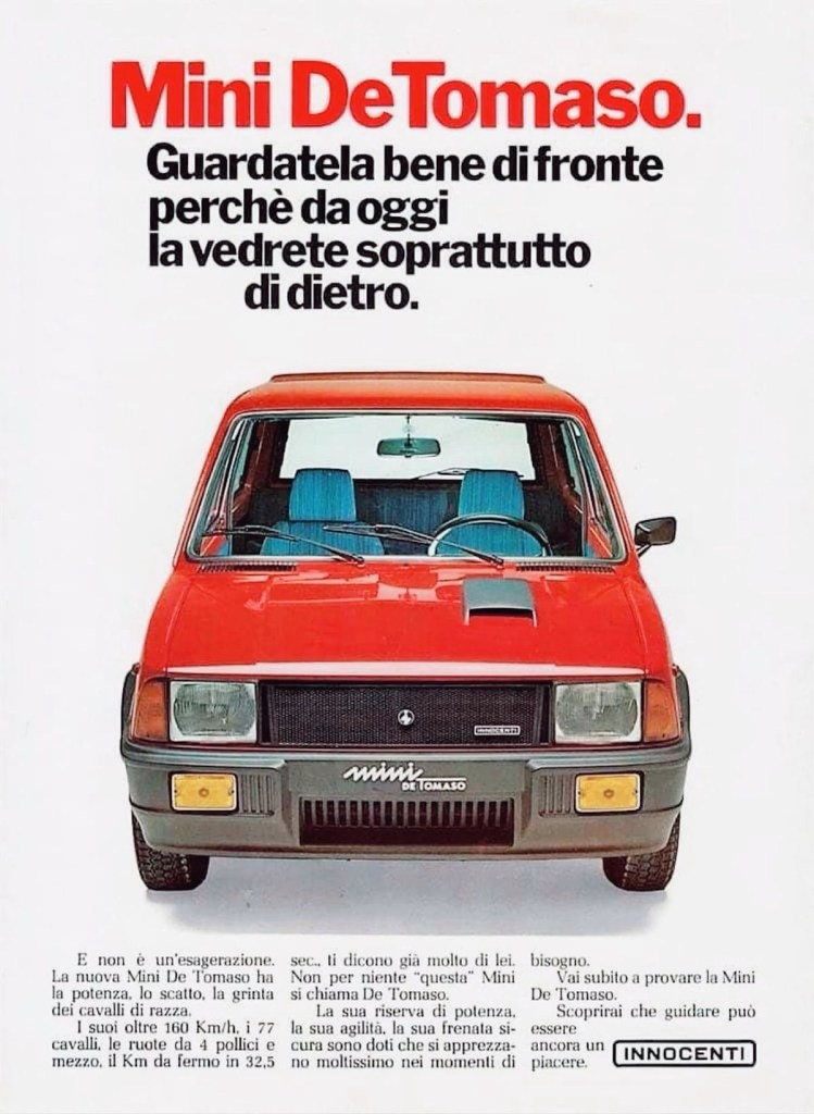 Era il 1978, e l’autunno già bussava con le sue prime foglie gialle lungo i viali. Noi scendevamo dalla città verso la campagna, a bordo della nostra Mini Innocenti De Tomaso nuova fiammante: rossa lucida, con le cromature che scintillavano sotto i lampioni. L’abitacolo era piccolo, ma ci sentivamo padroni del mondo. Io avevo appena vent’anni: il vento nei capelli, un maglione a collo alto color senape, i jeans a zampa che facevano parte del nostro tempo, e quelle giacche di velluto a coste larghe che sembravano abbracciare il corpo. Accanto, gli amici con i loro giubbotti di pelle e le camicie a quadri, pronti a ridere per un nonnulla.