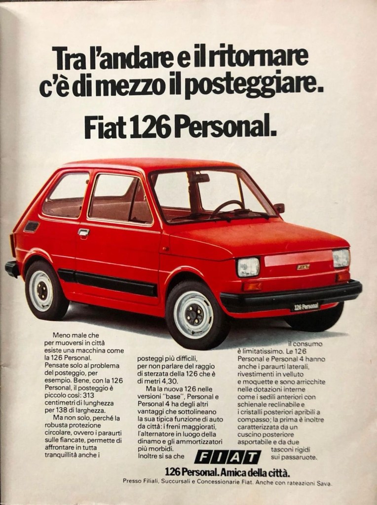 Guidare la 126 è stato un piacere tutto sommato semplice: il suo motore cantilenava sotto di me, lo sterzo era preciso come un compagno educato. Ogni tanto lasciavo che lo sguardo sfuggisse alla strada, per raccogliere una scena — un contadino che chiacchierava con il suo cane, una casa con le gerani alle finestre, un cielo che si tingeva di un azzurro più profondo. Mi sentivo giovane e leggero, come chi crede ancora che basti un mazzo di fiori e un buon vestito per aggiustare le cose del mondo.