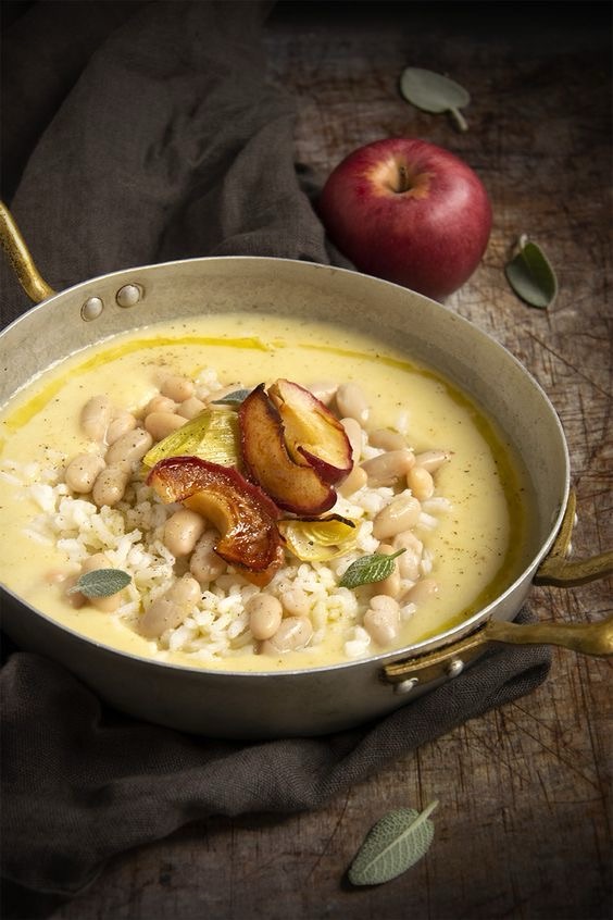 Ogni cucchiaio è un ricordo: la luce bassa del pomeriggio che filtra dalla finestra, la casa che profuma di brodo e buccia di mela, le mani di qualcuno che mescolano piano come per non svegliare l’autunno. Questa zuppa nasce lì — tra la dolcezza innocente delle mele e la calma saporita del porro — e si addensa con il riso e i cannellini come una coperta che ci riporta alle domeniche di una volta.