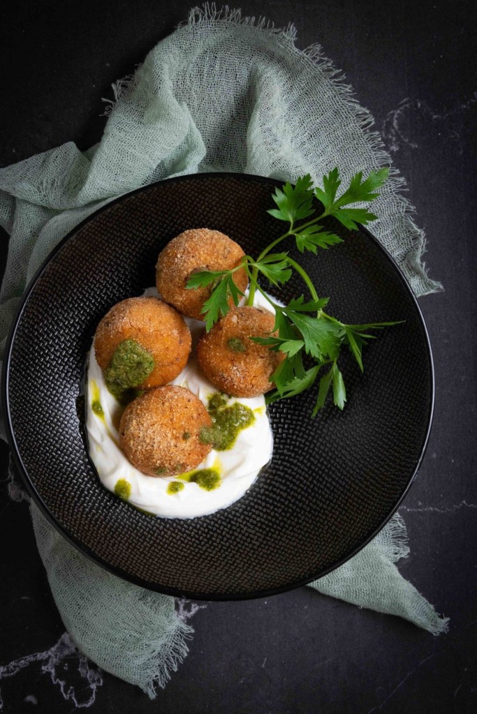 Polpette di cannellini e olive taggiasche su crema di formaggio