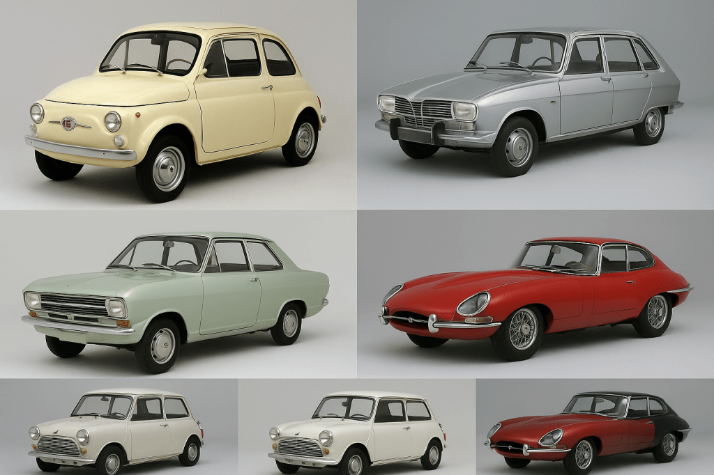 Le strade erano un teatro: le 500 sfrecciavano tra i colli, le Kadett attraversavano città tedesche in pieno sviluppo, le Renault 16 si fermavano davanti alle boulangerie, e le Jaguar dormivano nei garage londinesi con un’aria da diva.