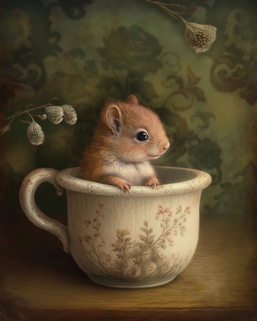 Una mattina d’autunno, quando il sole filtrava come polvere dorata tra le tende, un piccolo topolino dal pelo color nocciola saltò sul tavolo in cerca di un rifugio caldo. Vide la tazza, vi infilò il musetto curioso e, con un sospiro felice, ci si rannicchiò dentro.