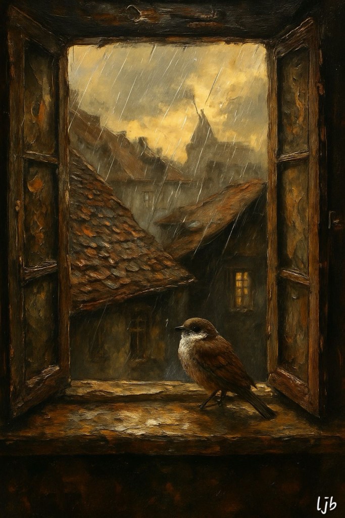 Ma ecco una casa, una luce dorata, una finestra appena socchiusa, incantata. Dentro, il tepore, il profumo del pane, fuori, la pioggia che canta lontane.