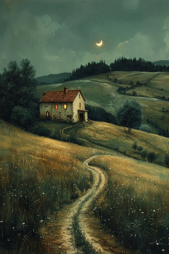 Là, sulla collina, la casa riposa, una luce si accende — promessa o saluto? Forse è mia madre che aspetta la cena, forse è la sera che invita al perdono.
