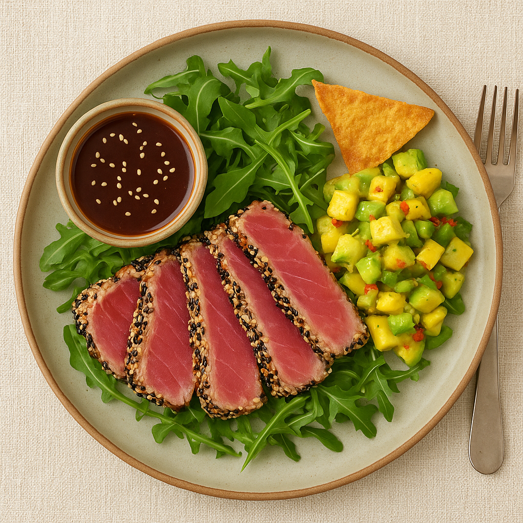 600 g di tonno fresco (sashimi-grade), in un unico trancio 60 g semi di sesamo (30 g bianchi + 30 g neri) 2 cucchiai olio extravergine d’oliva + 1 cucchiaino olio di sesamo tostato 3 cucchiai salsa di soia (circa 45 ml) 1 cucchiaio miso bianco (opzionale, per la profondità umami) 1 cucchiaio miele liquido (o sciroppo d’agave) succo e scorza di 1 lime 1 cucchiaino zenzero fresco grattugiato 1 cucchiaino vodka (facoltativo — omaggio agli anni ’90) 1 mango maturo, a cubetti 1 avocado maturo, a cubetti 1 cipollotto, affettato sottile 1 peperoncino fresco piccolo, privato dei semi e tritato finemente (regola secondo il coraggio arietino) 100 g rucola baby per servire sale fino, pepe nero macinato fresco crostini sottili o chips di patata dolce per il contrasto croccante