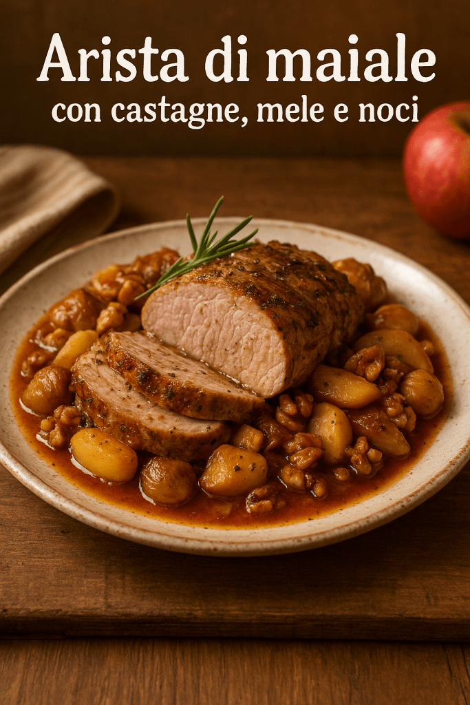 Rosolare la carne Lega l’arista con spago da cucina per mantenerne la forma. In una casseruola capiente scalda 4 cucchiai d’olio, aggiungi la cipolla tritata e fallo imbiondire. Adagia l’arista e rosolala bene da tutti i lati, finché non sarà dorata. Sfumare Versa il bicchiere di vino bianco e lascia evaporare a fiamma vivace. Aromatizzare Aggiungi rosmarino e salvia legati insieme (per poterli togliere facilmente in seguito). Versa la polpa di pomodoro e un mestolo di brodo caldo. Copri e lascia cuocere a fuoco basso per circa 1 ora e 15 minuti, girando di tanto in tanto. Frutta e frutta secca Dopo 45 minuti di cottura, aggiungi le mele sbucciate e tagliate a spicchi, le castagne lessate e le noci spezzettate grossolanamente. Mescola delicatamente e lascia cuocere con il resto dell’arista: la mela si scioglierà parzialmente creando una salsa vellutata, mentre noci e castagne daranno croccantezza e corpo. Finale Quando la carne sarà tenera, spegni il fuoco e lasciala riposare per 10 minuti coperta. Elimina il mazzetto aromatico e affetta l’arista. Servi le fette nappate con il sughetto ricco di frutta e pomodoro.