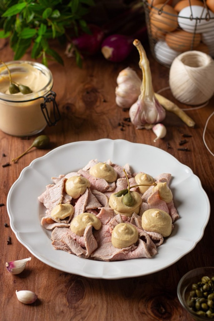 800 g di magatello di vitello 1 carota, 1 cipolla, 1 gambo di sedano 2 chiodi di garofano 2 foglie di alloro 1 bicchiere di vino bianco secco 200 g di tonno sott’olio sgocciolato 2 uova sode (solo tuorli) 4 filetti di acciughe sott’olio 1 cucchiaio di capperi sotto sale (ben dissalati) Olio extravergine d’oliva q.b. Succo di mezzo limone Sale e pepe
