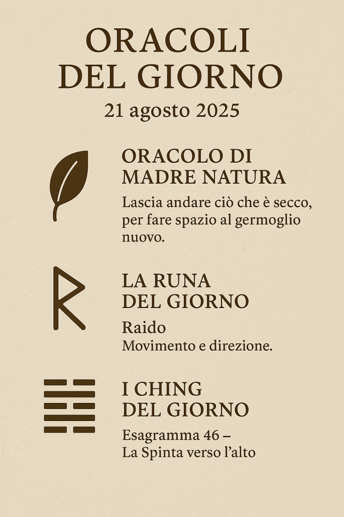 Natura: lascia andare il vecchio. Runa: metti in moto il tuo cammino. I Ching: cresci con pazienza, come una pianta che cerca la luce.
