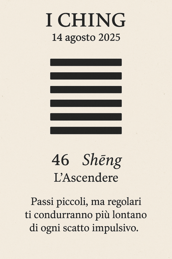 Oggi l’I Ching ti parla di crescita costante e paziente. È l’energia del seme che, pur non vedendo ancora la luce, spinge verso la superficie, nutrendosi del buio fertile della terra.